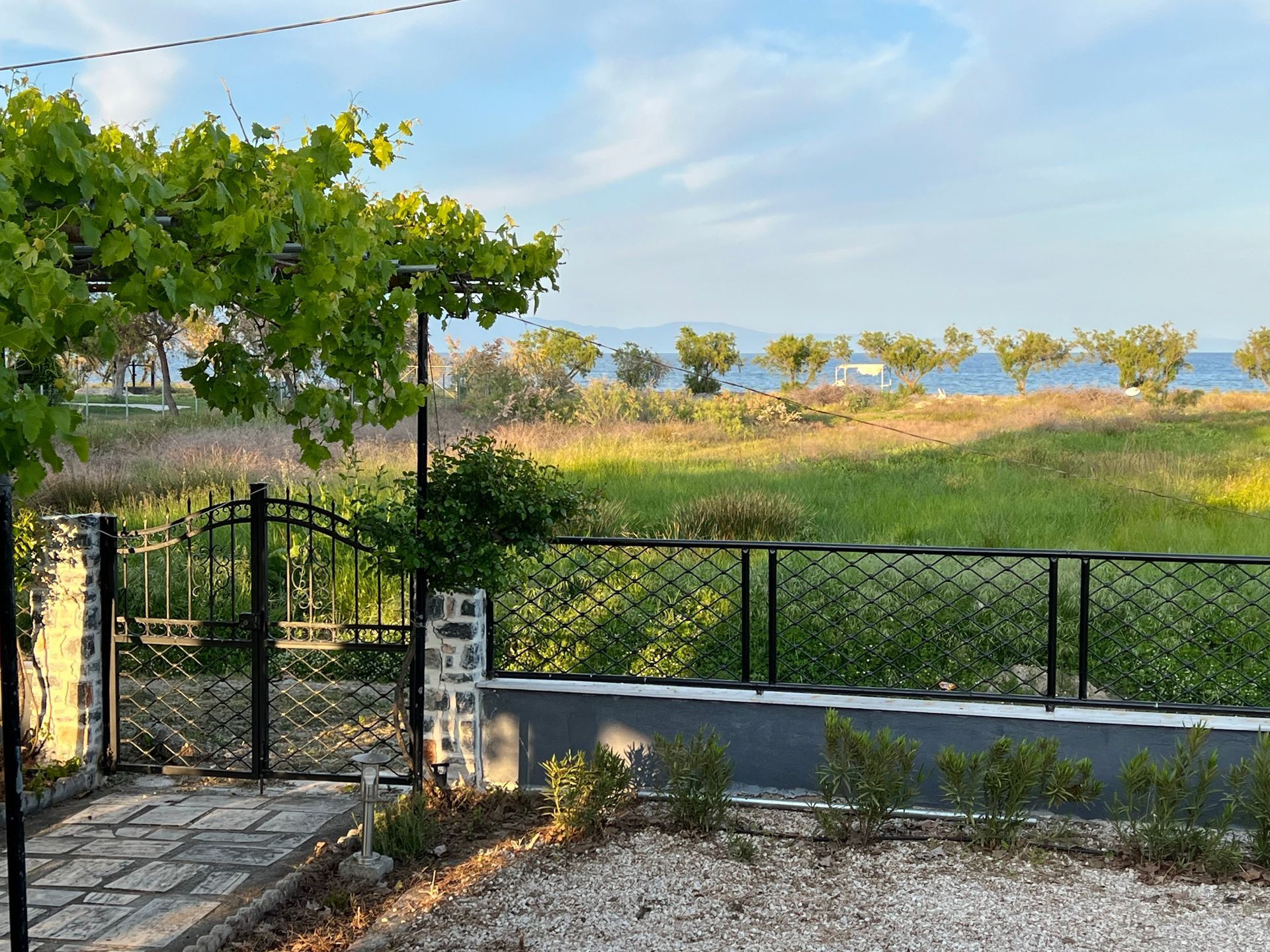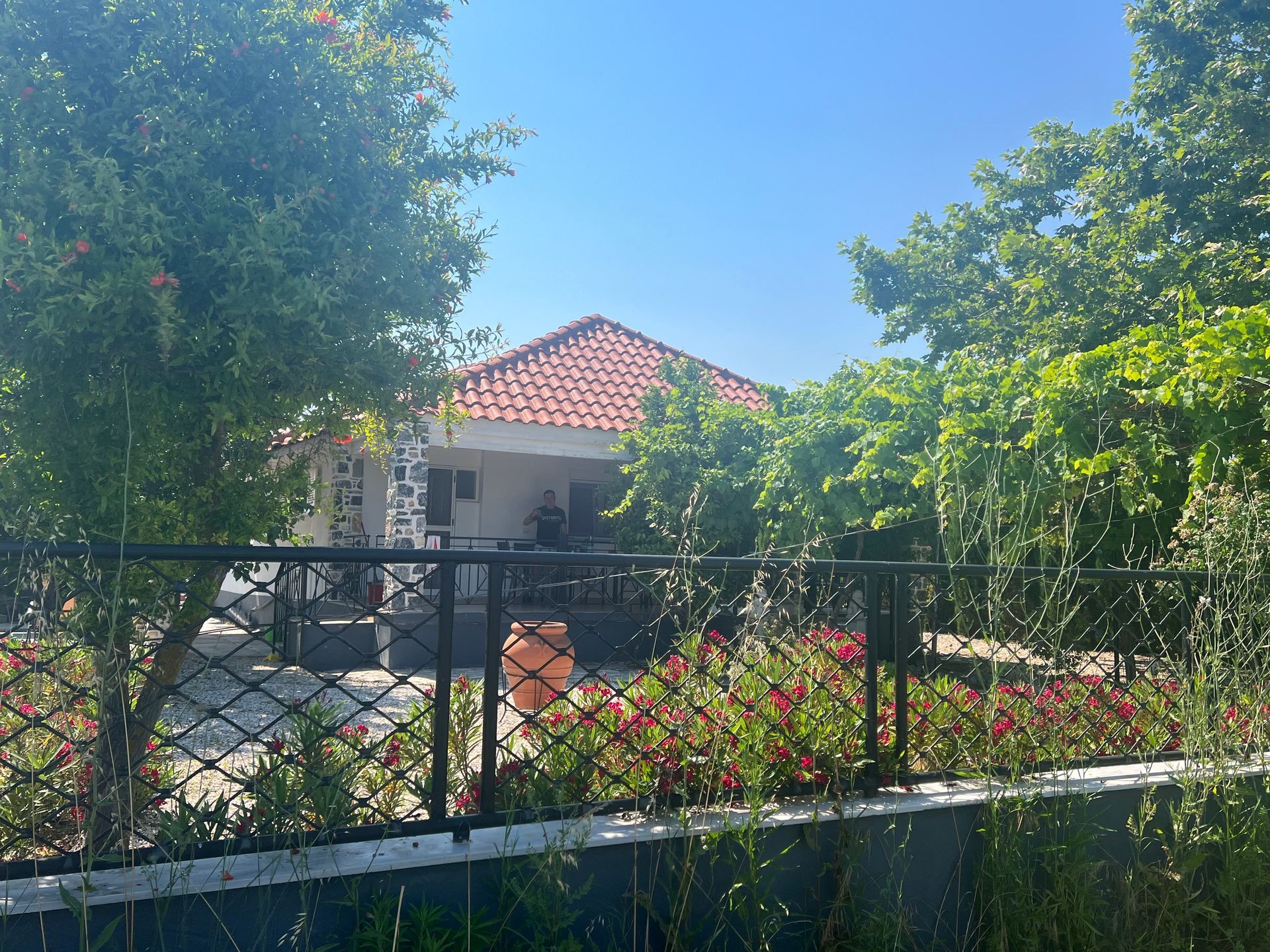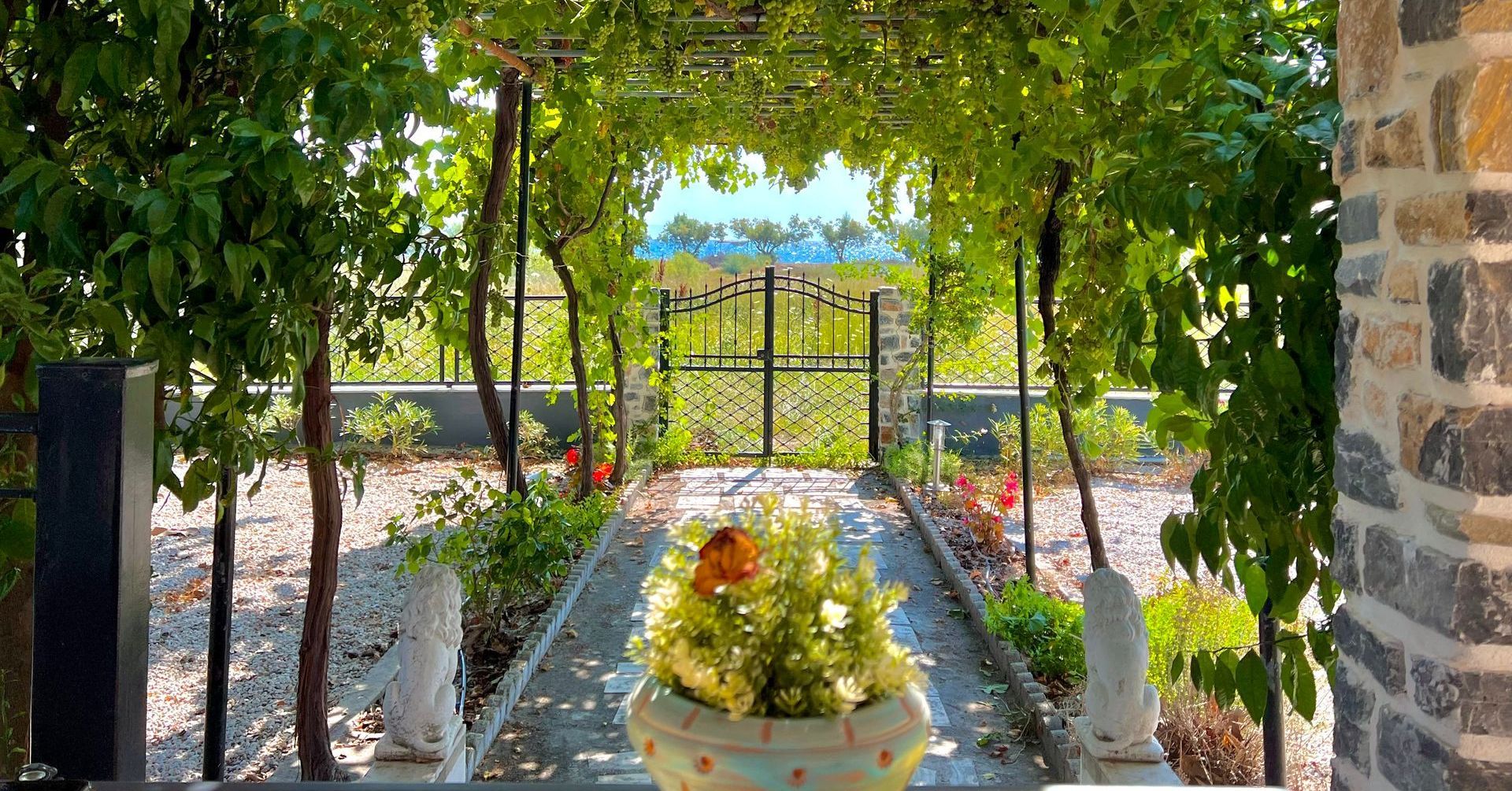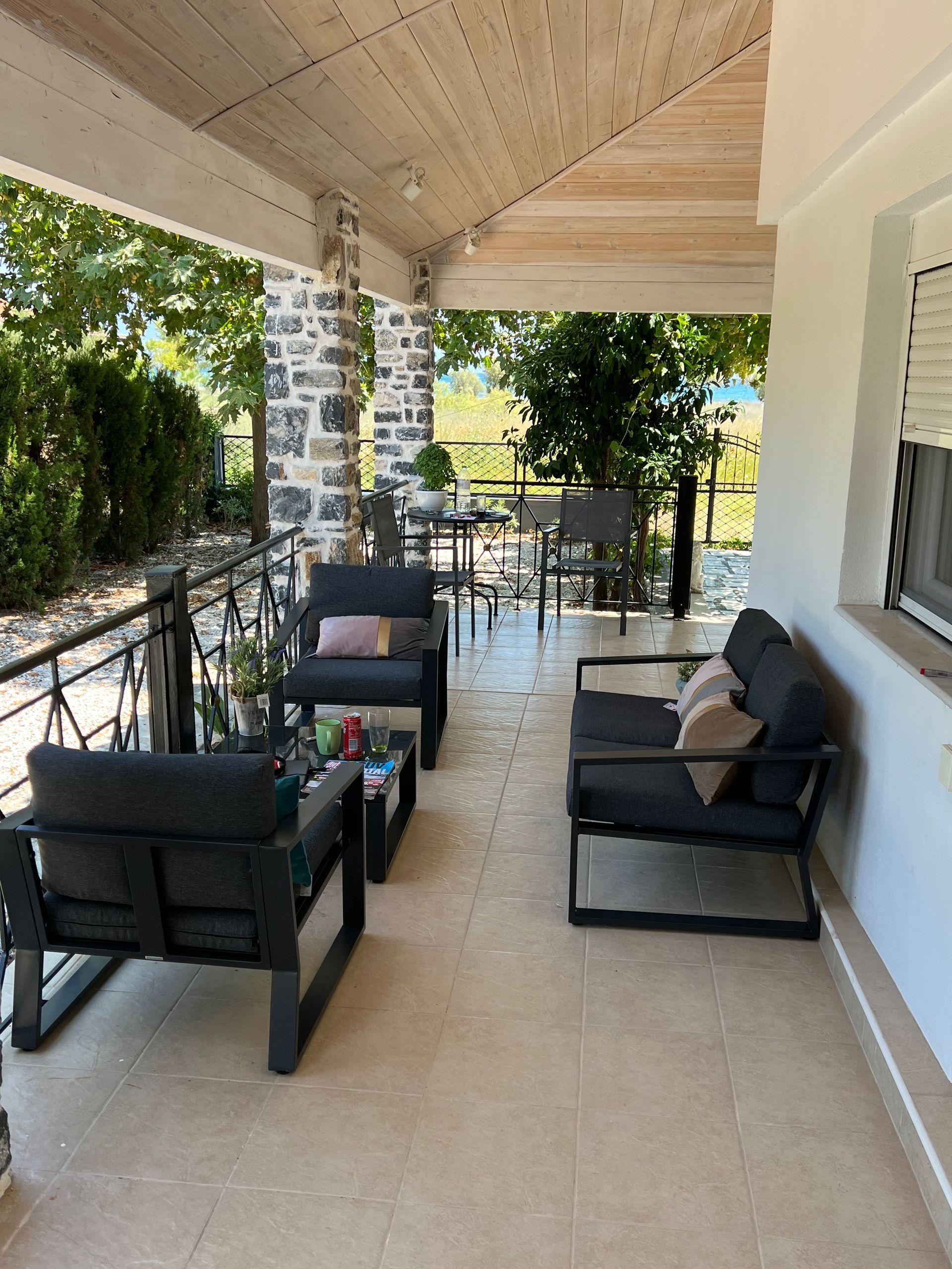 Eine wunderschöne Weinlaube sowie eine große, alte Platane spenden reichlich Schatten. Im Sommer kann das Thermometer schon einmal 40 Grad erreichen. Begünstigt durch den Meltemi-Wind, der den Golf von Volos umweht, gibt es immer eine sanfte, angenehme Brise die pünktlich zum Abend endet. So lässt es sich auf der Terasse wunderbar verweilen und die Stunden vergehen im Fluge...