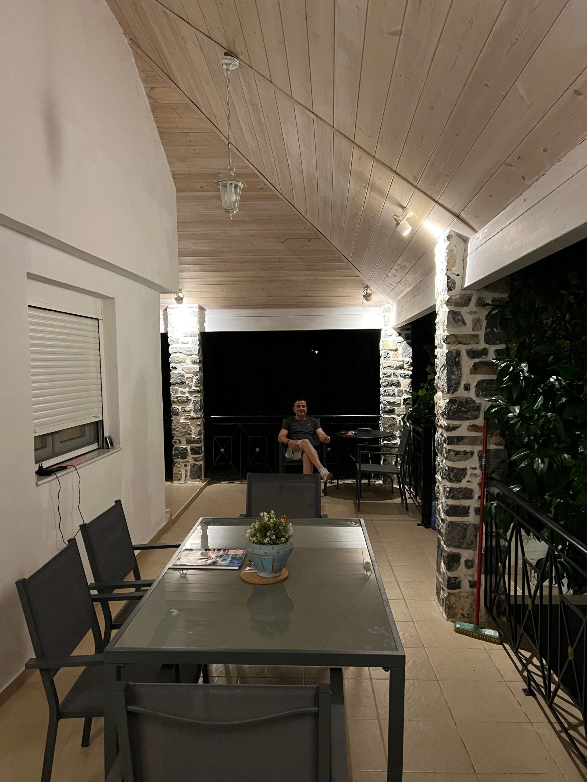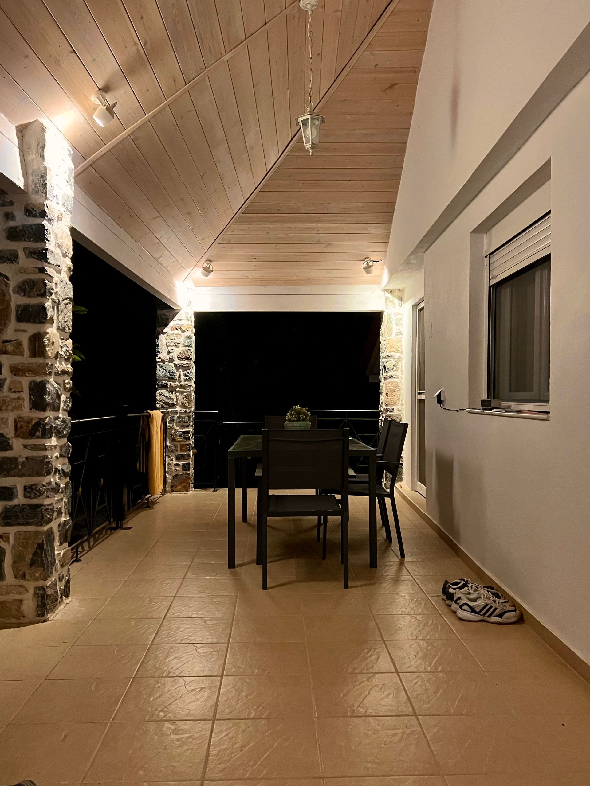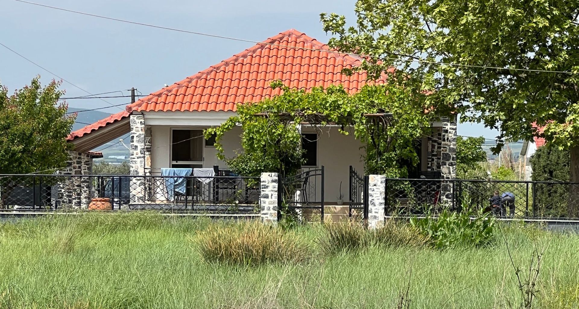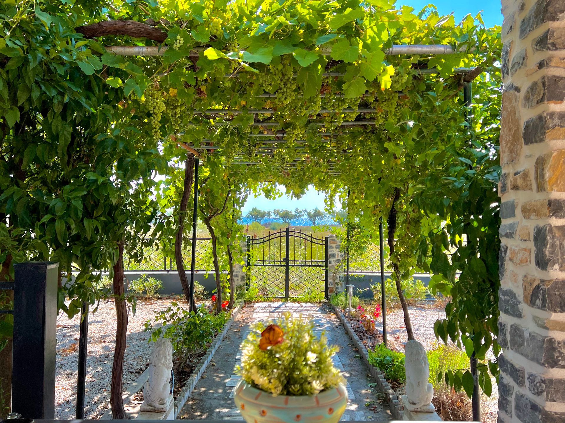 Eine wunderschöne Weinlaube sowie eine große, alte Platane spenden reichlich Schatten. Im Sommer kann das Thermometer schon einmal 40 Grad erreichen. Begünstigt durch den Meltemi-Wind, der den Golf von Volos umweht, gibt es immer eine sanfte, angenehme Brise die pünktlich zum Abend endet. So lässt es sich auf der Terasse wunderbar verweilen und die Stunden vergehen im Fluge...